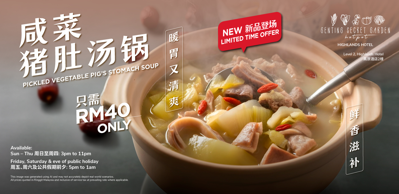 Proudly operated by Resorts World Genting, our restaurant offers a unique hotpot dining experience at the top of the hills. Choose from eight different broths made of quality ingredients and an impressive assortment of premium cuts, handmade meatballs, and fresh seafood platter. Our organic vegetables are harvested from our very own Greenhouse located within Genting Secret Garden Hotpot.
