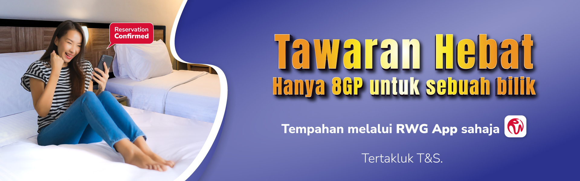 Sebagai penghargaan kepada ahli Genting Rewards, kami menawarkan promosi istimewa yang tidak boleh dilepaskan. Untuk masa terhad, anda boleh menempah Bilik Standard di First World Hotel dengan hanya 8GP melalui Aplikasi RWG.