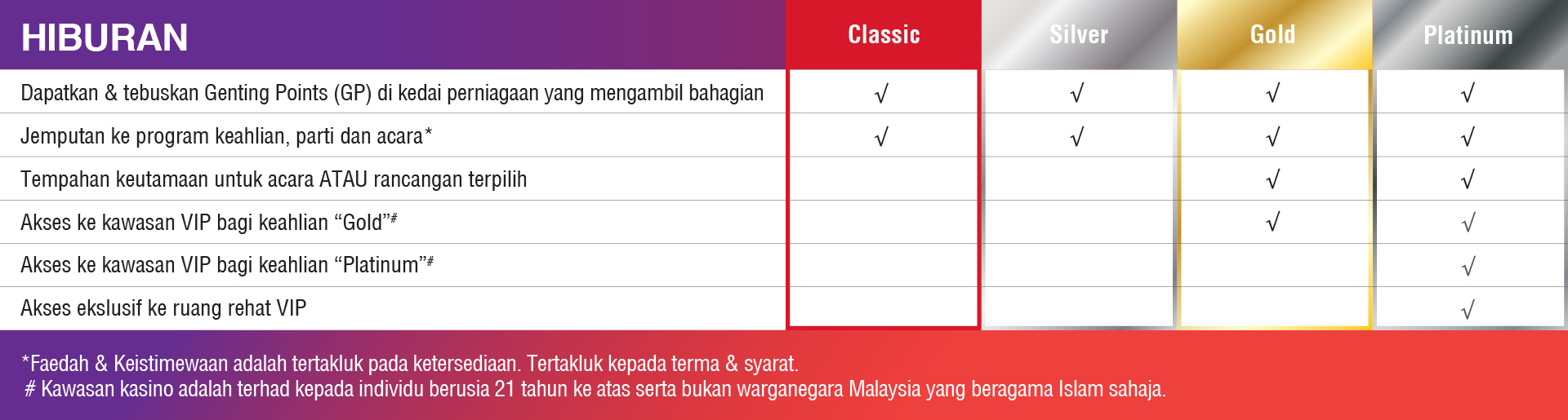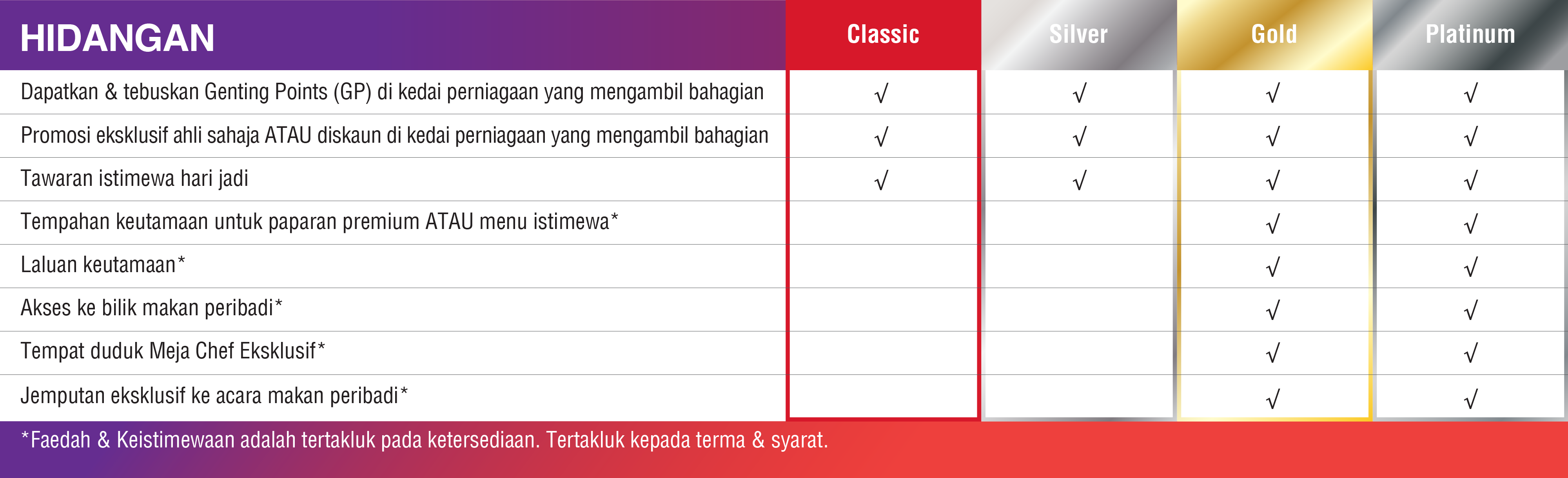 - Kadar bilik eksklusif khas untuk ahli dan naik taraf bilik secara percuma adalah tertakluk pada ketersediaan. Tarikh black-out mungkin dikenakan. Setiap ahli mendapat maksimum dua bilik setiap malam. Untuk pertanyaan atau tempahan, boleh log masuk ke laman web rasmi Resort World Genting (RWG) https://www.rwgenting.com/Hotels/, muat turun aplikasi mudah alih RWG atau hubungi talian hotline Perkhidmatan Pelanggan +603-27181118.