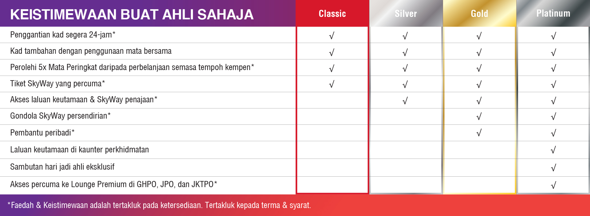 - Polisi, terma dan syarat lain yang berkaitan dengan keistimewaan tertakluk, termasuk tetapi tidak terhad kepada peraturan dan undang-undang taman tema SkyWorlds, dan dasar piawai yang berkaitan dengan Kelab, kawasan VIP dan ruang istirahat.