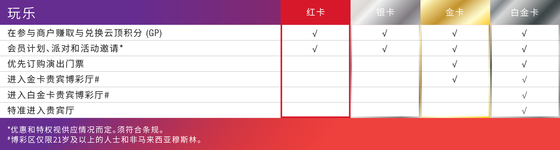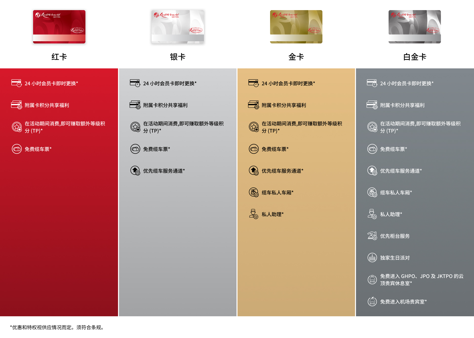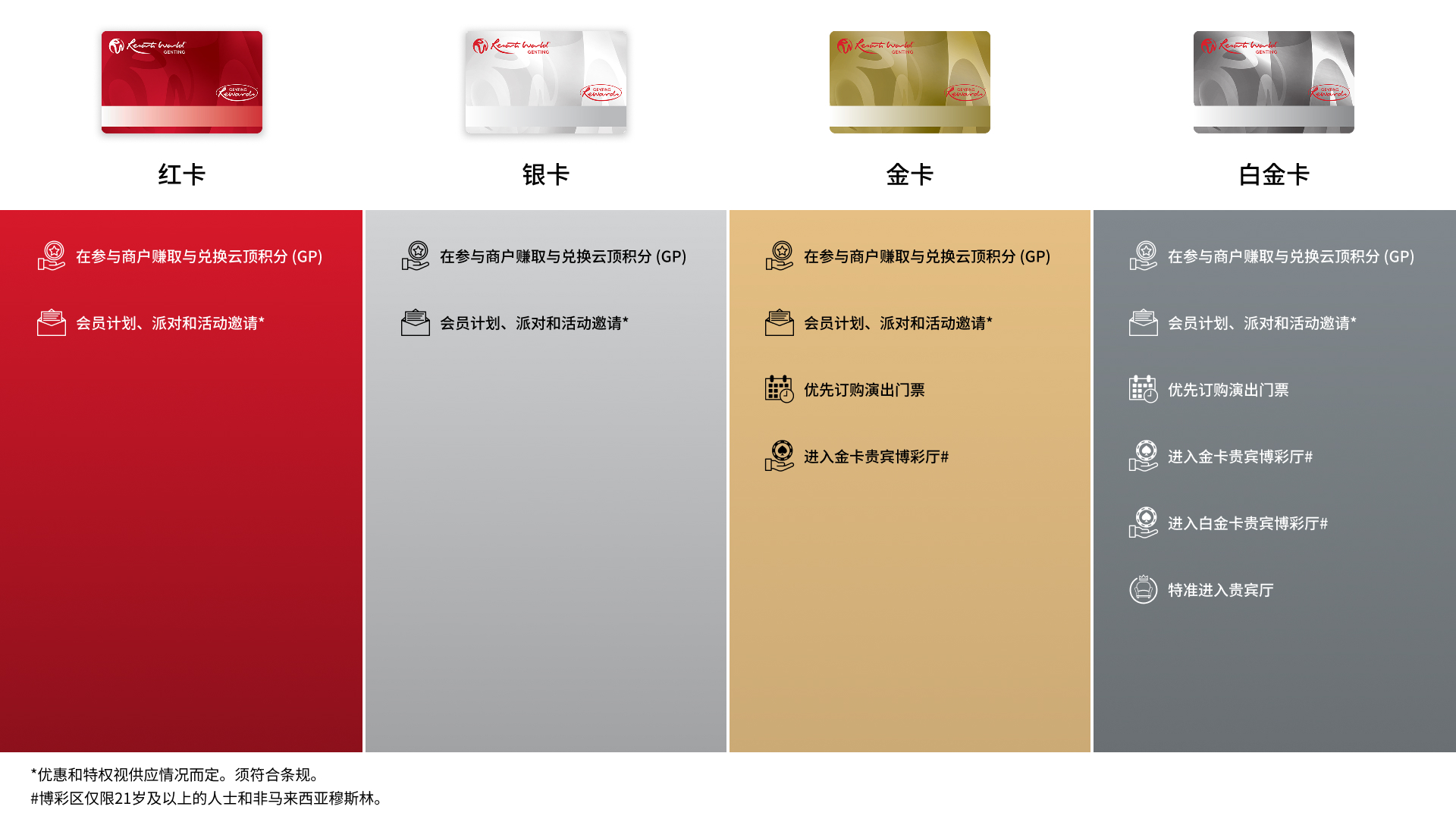 您可在云顶世界范围内消费时,包括餐饮、购物及玩乐等的同时赚取及兑换云顶积分(GP)。免费申请会员籍,并发掘一个全新的会员专属的奖赏世界。