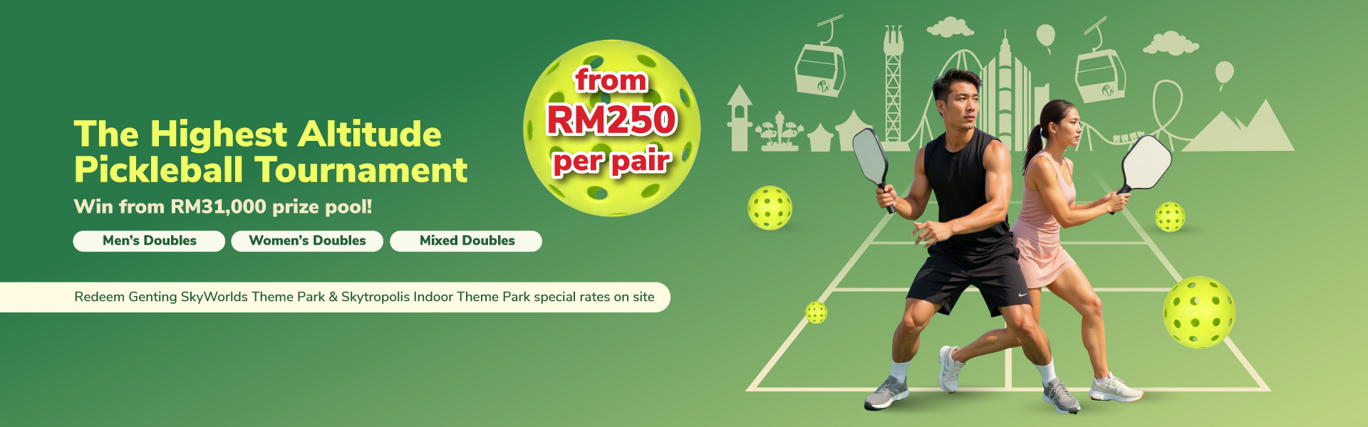 Serve up fun at the first-ever pickleball tournament at the Highlands! Whether you are just in for the vibes or to increase your DUPR, this is your chance to dink it on the court and unwind in style. Get our exclusive room packages at Resorts World Awana and enjoy a full weekend of play and stay.