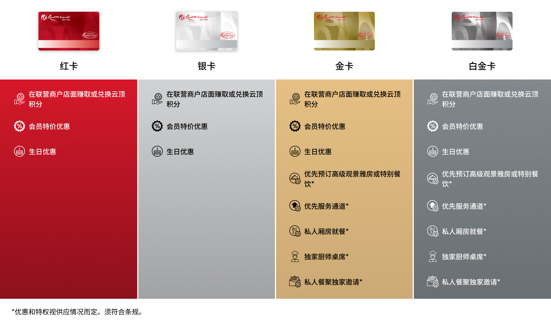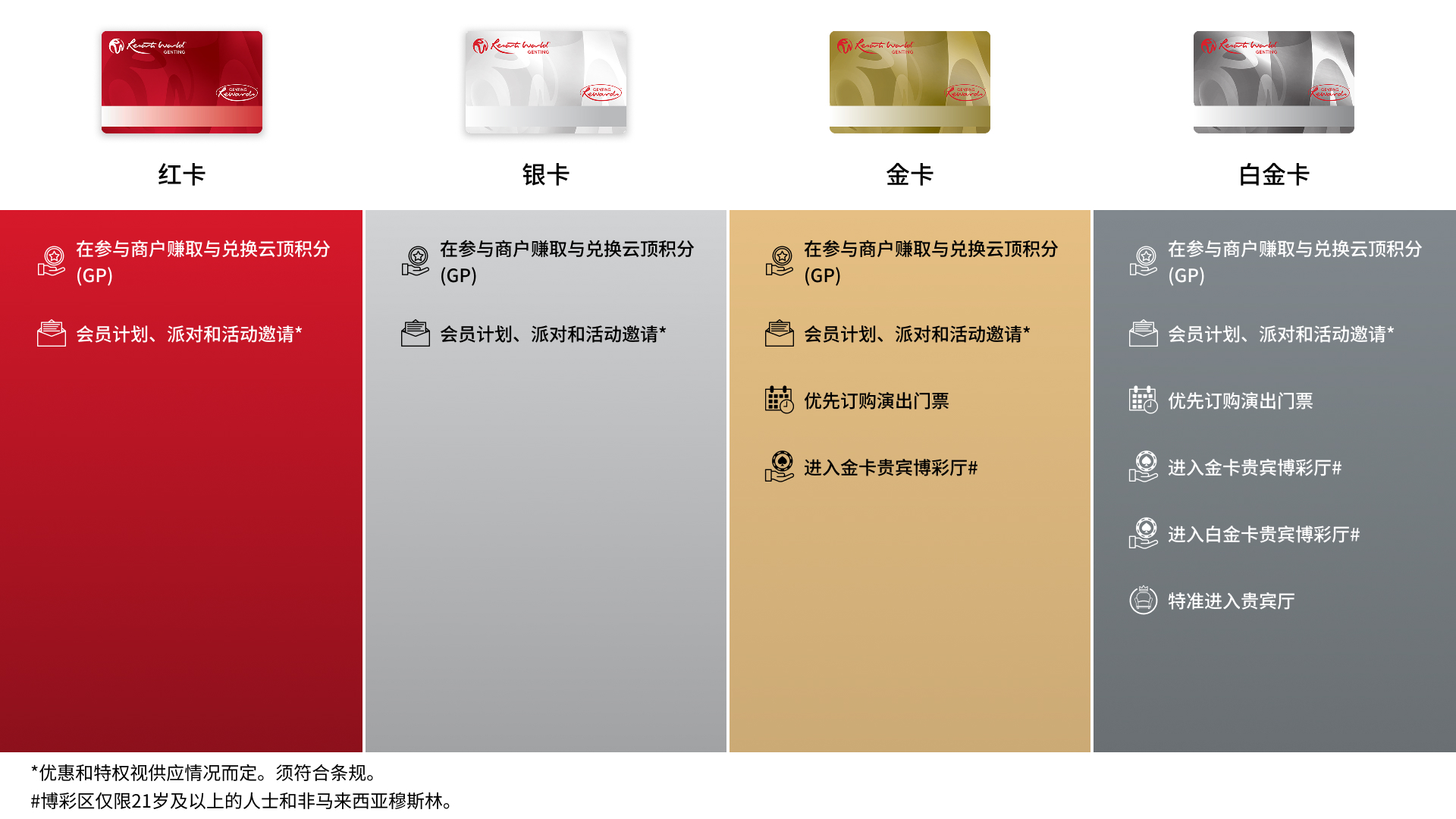 您可在云顶世界范围内消费时,包括餐饮、购物及玩乐等的同时赚取及兑换云顶积分(GP)。免费申请会员籍,并发掘一个全新的会员专属的奖赏世界。