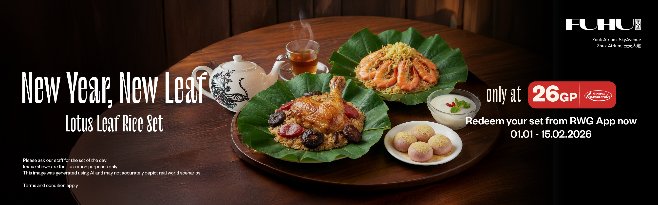 | Redeem with 26 GP on the Resorts World Genting (RWG) app | One Set of Lotus Leaf Rice + One Chinese Tea + Dessert |