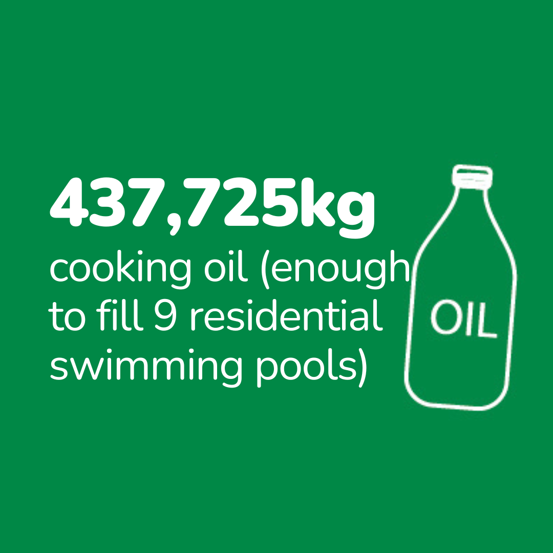 In addition to responsible waste management, we began to recycle used oil to protect waterways from pollution and promotes a circular economy. In 2023, we collected approximately 102,918kg used cooking oil. These are subsequently managed and recycled by third party vendors.