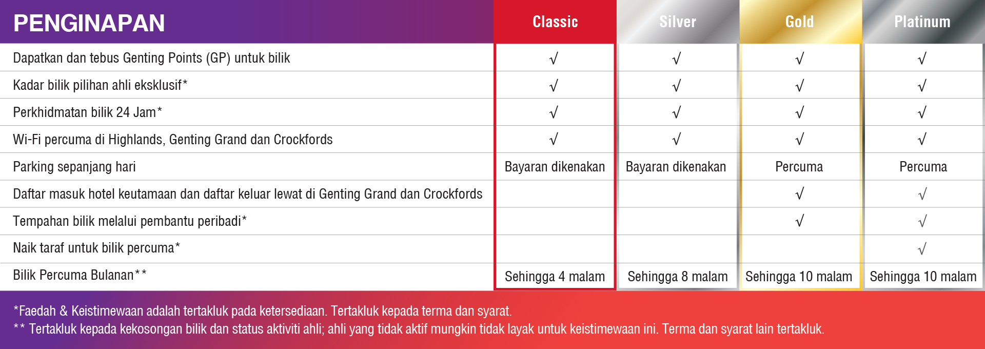 - Kadar bilik eksklusif khas untuk ahli dan naik taraf bilik secara percuma adalah tertakluk pada ketersediaan. Tarikh black-out mungkin dikenakan. Setiap ahli mendapat maksimum dua bilik setiap malam. Untuk pertanyaan atau tempahan, boleh log masuk ke laman web rasmi Resort World Genting (RWG) https://www.rwgenting.com/Hotels/, muat turun aplikasi mudah alih RWG atau hubungi talian hotline Perkhidmatan Pelanggan +603-27181118.