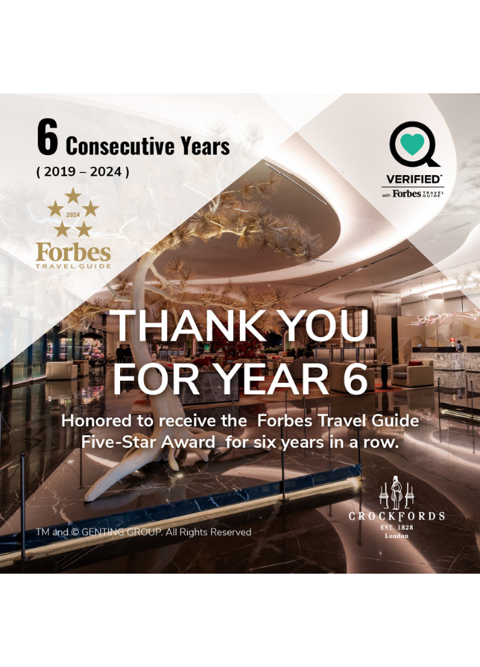 Crockfords di Resorts World Genting (RWG) sekali lagi diangkat sebagai salah satu hotel dan destinasi terbaik di dunia dengan mengekalkan penarafan 5 Bintang Forbes Travel Guide. Hotel ini telah memperoleh anugerah berprestij ini selama enam secara berturut-turut.