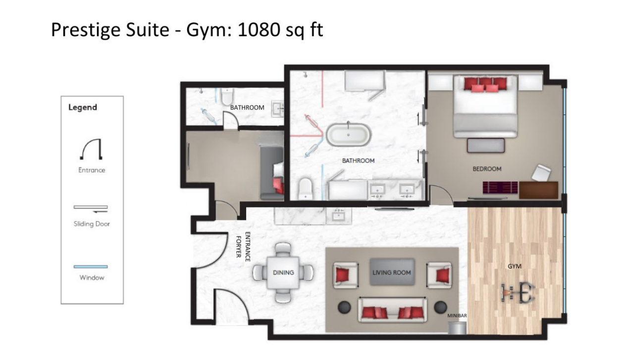 Suite seluas 1,080 kps dengan rekaan indah, lengkap dengan peralatan untuk sesi senaman peribadi dan balkoni dengan pemandangan gunung yang indah