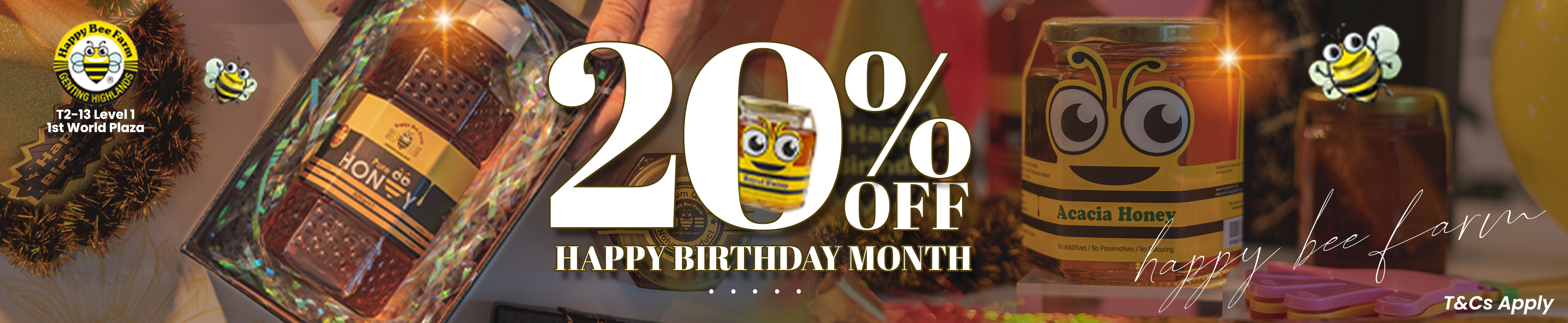 让Happy Bee Farm为您打造一个最最甜蜜的生日!在生日月份里光临Happy Bee Farm云天大道分店的云尊奖赏会员将可获得总消费额的20%折扣。附条规。